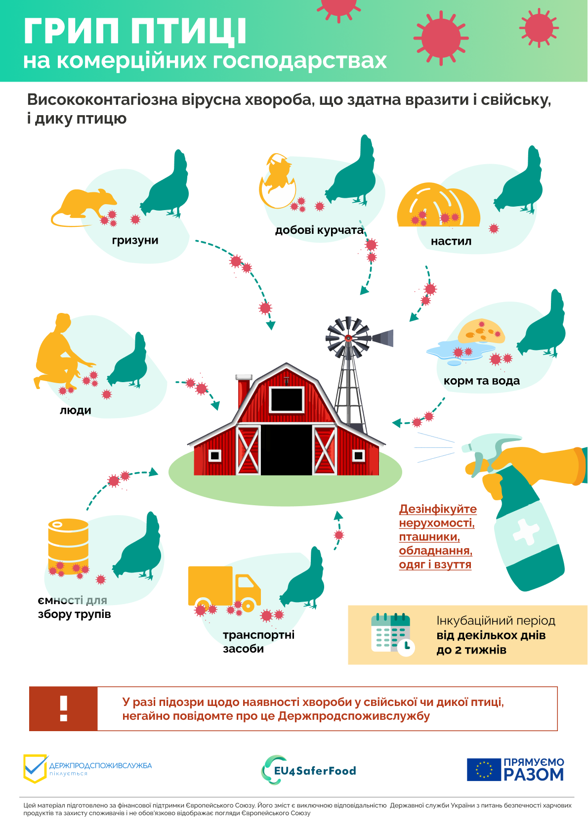 Детальніше про шляхи поширення вірусу грипу птиці в комерційних господарствах – в інфографіці, яка розроблена спільно з європейським проєктом EU4SaferFood.