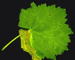 На листках можна спостерігати некротичні плями, оточені знебарвленим ореолом, якщо зараження відбувається через краплі забрудненого соку, що падають на молодий листок, або внаслідок іншого зовнішнього забруднення. Зрештою, центральна суха частина плями відпадає, і з’являється симптом «прострілу». Однак, коли зараження досягає листка через черешок, виникають некротичні ділянки, оточені ореолом.
