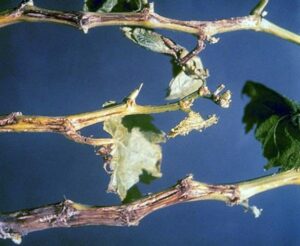 Вони також можуть з’являтися на головних та вторинних квітконосах та плодоніжках. Залежно від віку заражених пагонів, бактерія може вижити та розвинутися в пагін. Такі пагони можуть або мати виразки (зазвичай на нижніх міжвузлях), або не мати видимих симптомів, будучи латентно зараженими. Майже всі частини рослин із симптомами захворювання демонструють коричневе знебарвлення тканин ксилеми на поздовжніх зрізах. На пагонах уражених рослин деяких сортів спостерігається пізнє та нерівномірне здерев’яніння. Загальний вигляд уражених виноградних лоз може змінюватися, уражені рослини менш прямостоячі, ніж здорові.