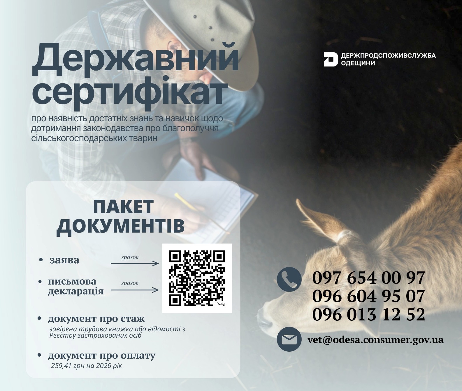 З 2026 року кожен, хто доглядає, перевозить або забиває тварин, має мати державний сертифікат про наявність достатніх знань та навичок у сфері благополуччя тварин. Він підтверджує ваші знання і навички та дозволяє працювати легально та безпечно.